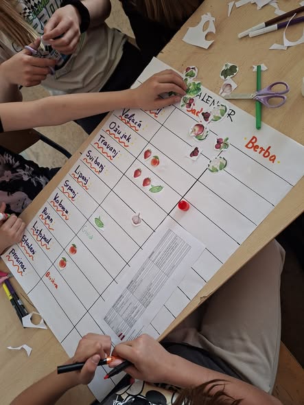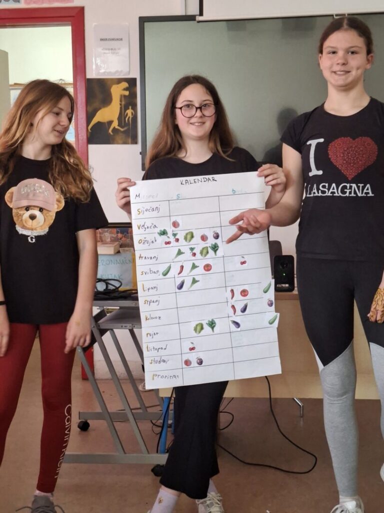 U prvom dijelu radionice učenici su kroz igru “Pogodi vrtlara” i prilagođenu igru “Voćna salata” učili o osnovama vrtlarstva i važnosti sezonskih namirnica. Kroz zajednički razgovor naglasak je stavljen na važnost konzumiranja lokalnog i sezonskog voća i povrća, nakon čega su učenici izrađivali vlastite kalendare sadnje i berbe.
