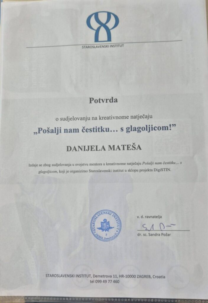 U prosincu je 2025. g. Staroslavenski institut u Zagrebu raspisao kreativni natječaj „Pošalji nam čestitku…s glagoljicom“. Trebalo je načiniti božićnu čestitku s motivom glagoljice.